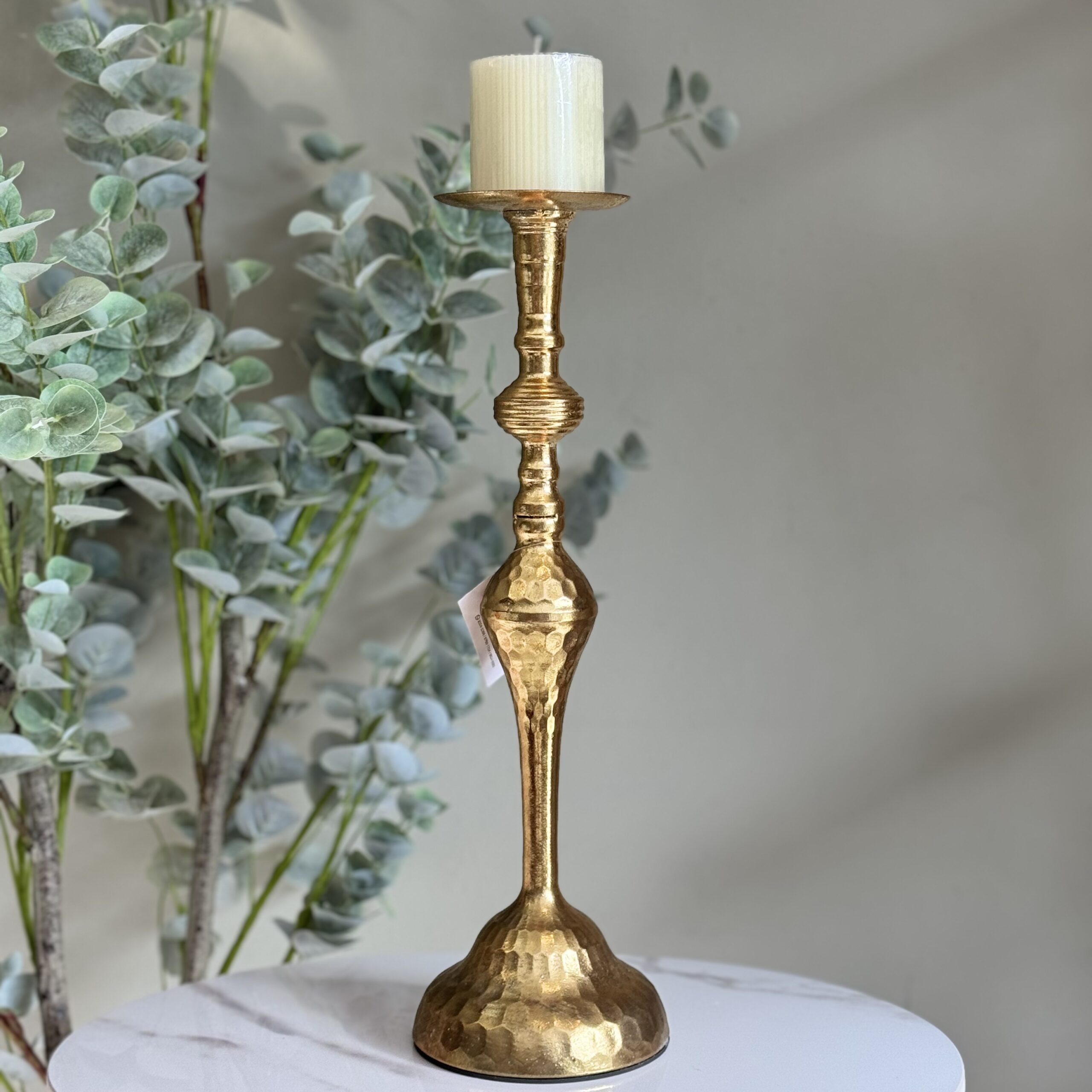 Candelabro de metal con acabado dorado martillado.