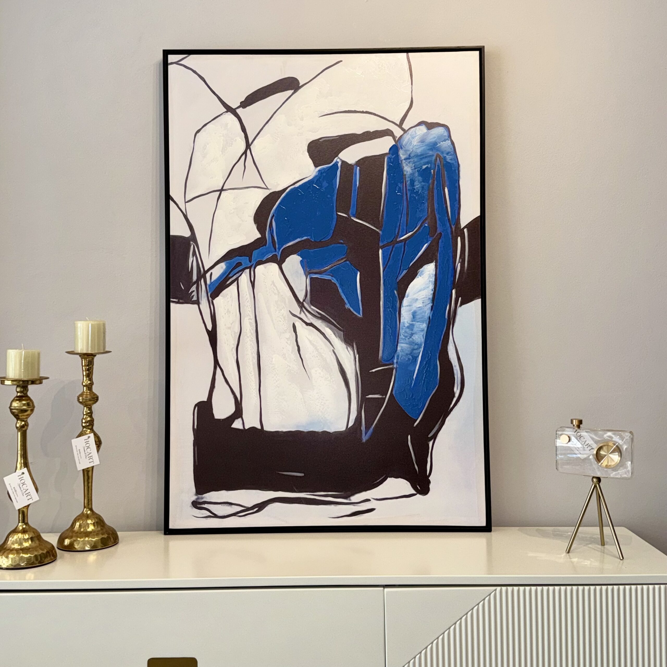 Obra abstracta contemporánea con trazos en negro, blanco y azul intenso que transmiten energía y movimiento. Ideal para espacios modernos, oficinas o salas que buscan un toque artístico y sofisticado.