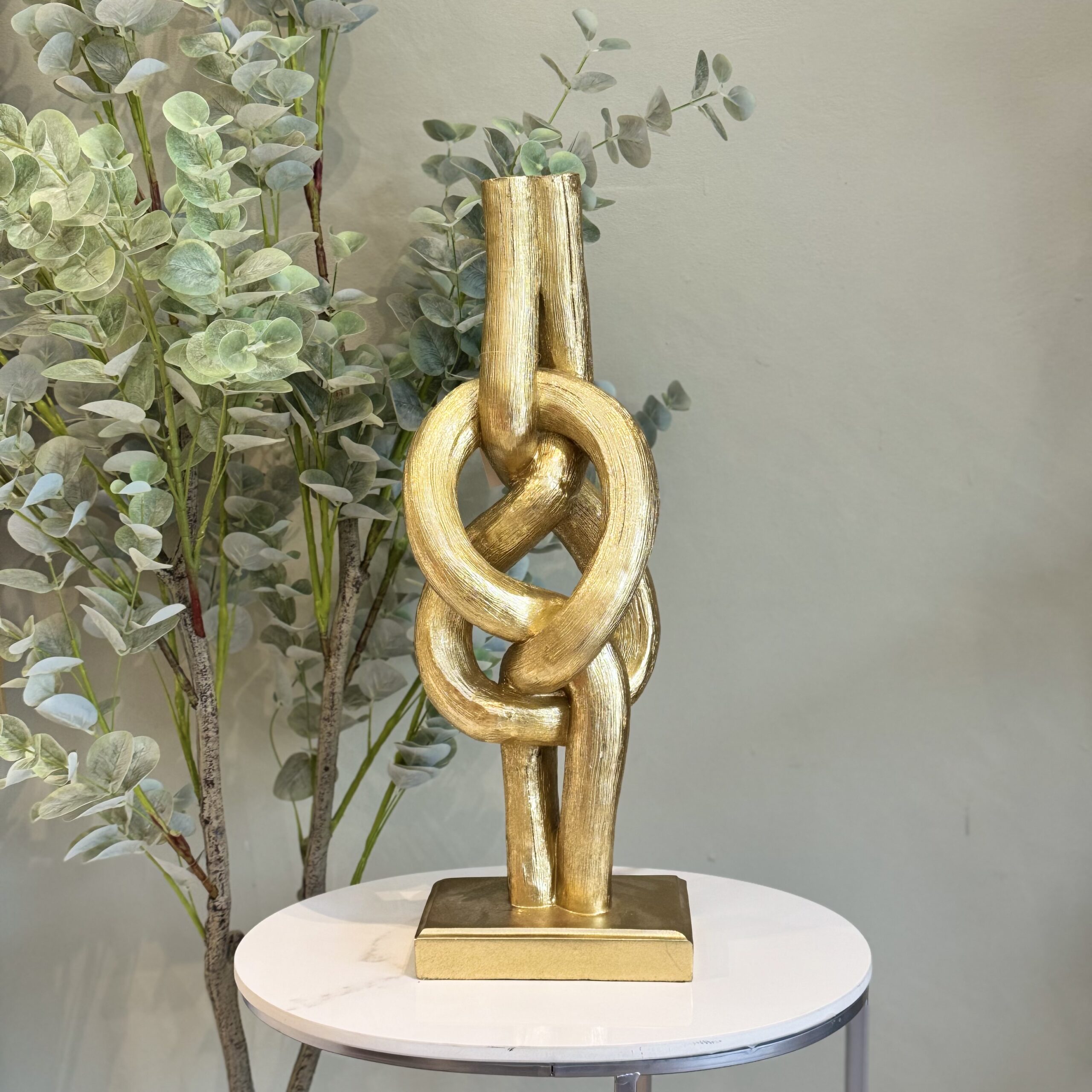 Escultura decorativa dorada con base negra, de diseño moderno y abstracto. Su estilo sofisticado y acabados brillantes la convierten en una pieza central ideal para resaltar la elegancia en salas, oficinas o espacios de lujo.