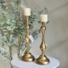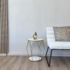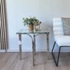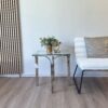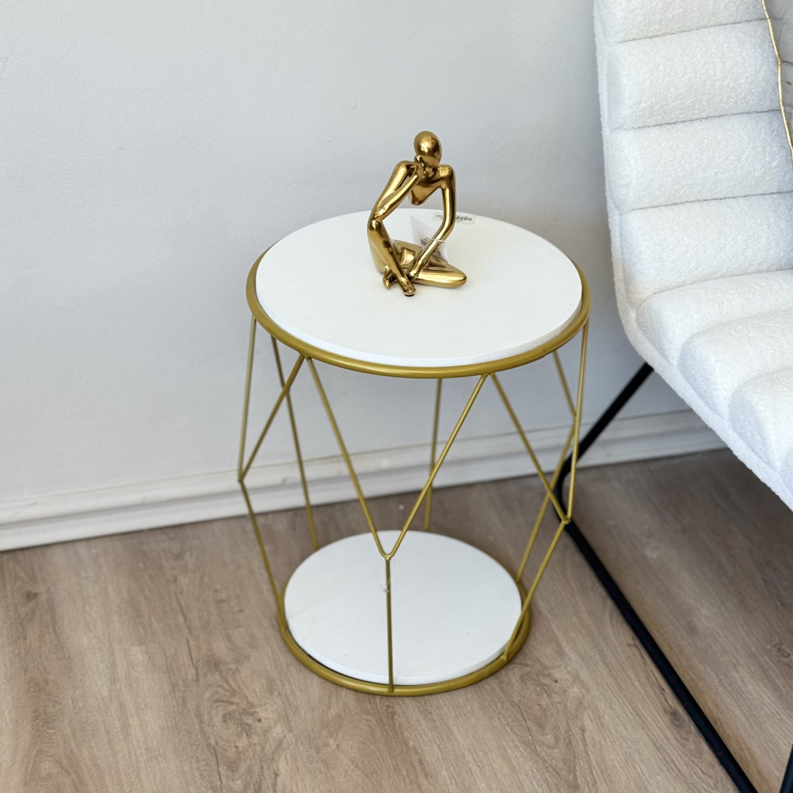 Mesa de noche con cajón amplio, acabado blanco y base metálica dorada de diseño geométrico. Ideal para aportar funcionalidad, elegancia y un estilo moderno al dormitorio.