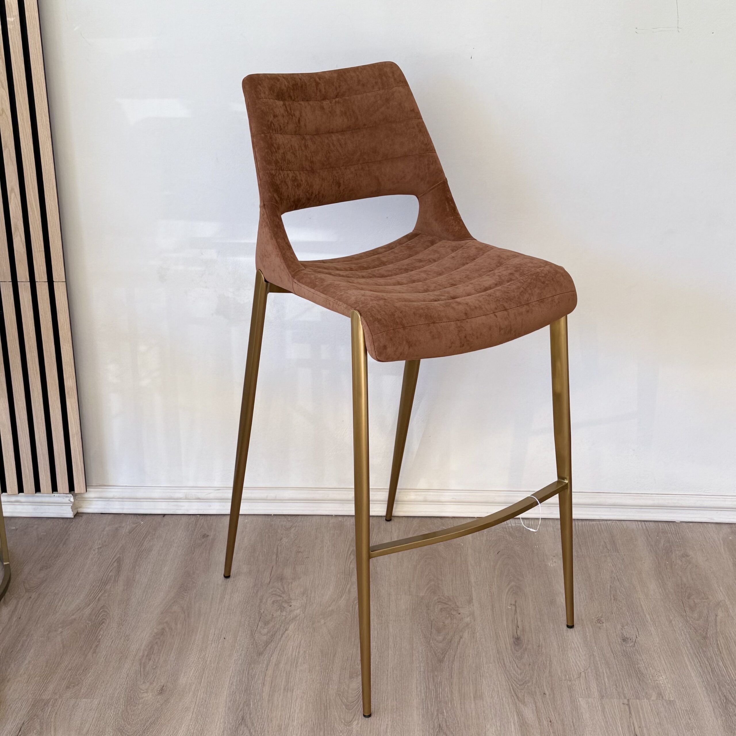 Silla alta con estructura metálica dorada y tapizado en suave tela tipo velvet color terracota. Su diseño ergonómico y respaldo curvado ofrecen comodidad y estilo, ideal para barras o cocinas modernas.